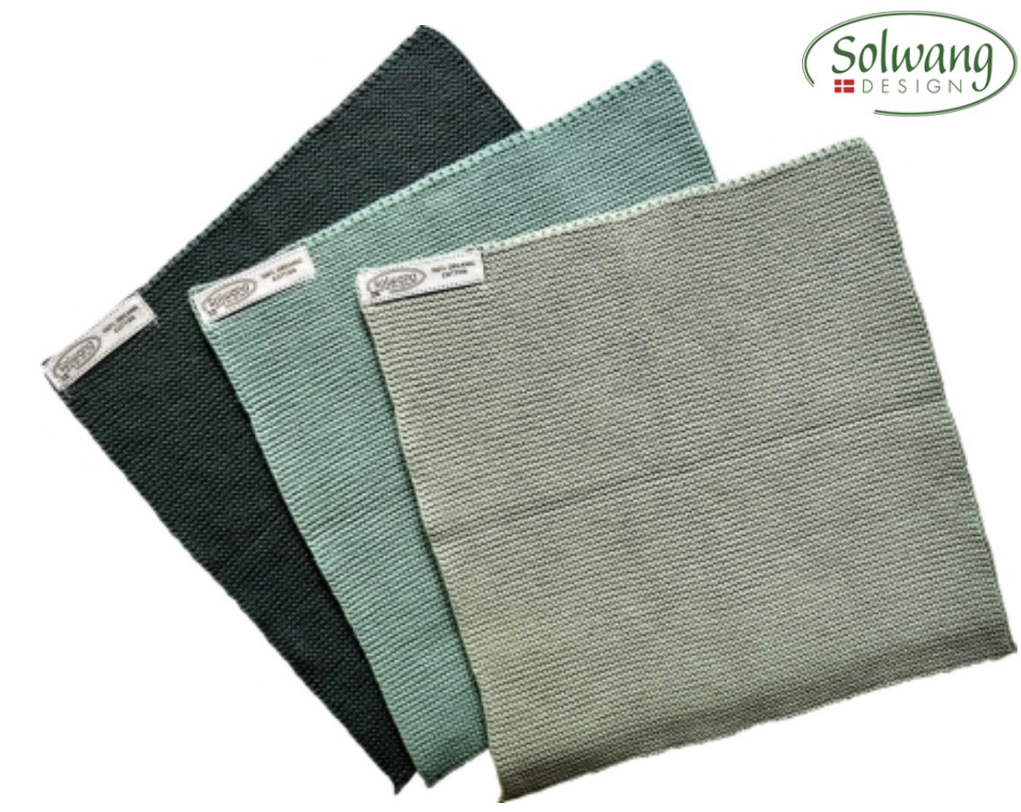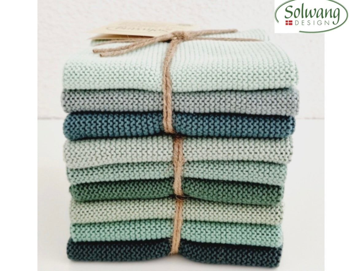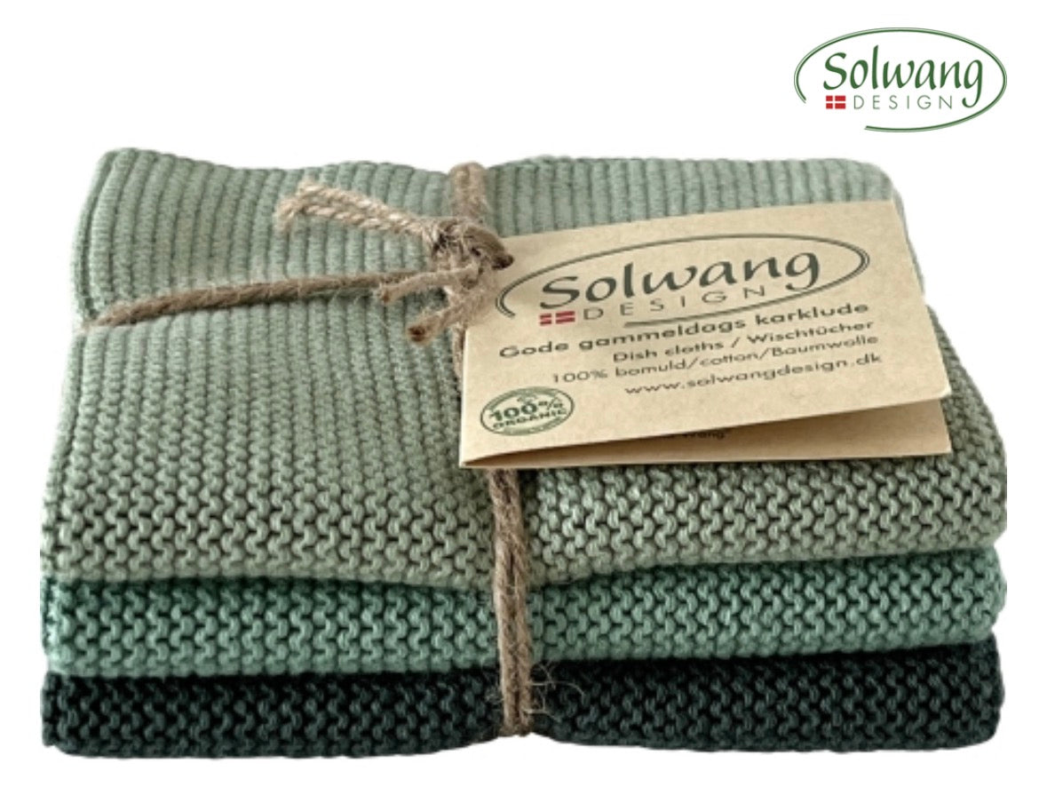 Wunderschön gestrickte Solwang Abwaschlappen in rustikalem Grün. Im 3er-Set gebunden mit Schnur und Etikett. Dabei sind die Spültücher in Krausrippe gestrickt um die Saugfähigkeit und Funktionalität zu optimieren.